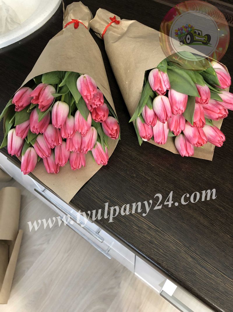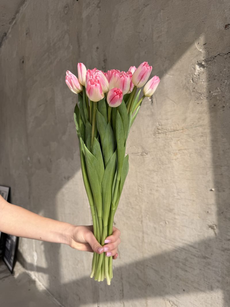 Розовый светлый бутон с белой каймой, листва и ножка средняя.