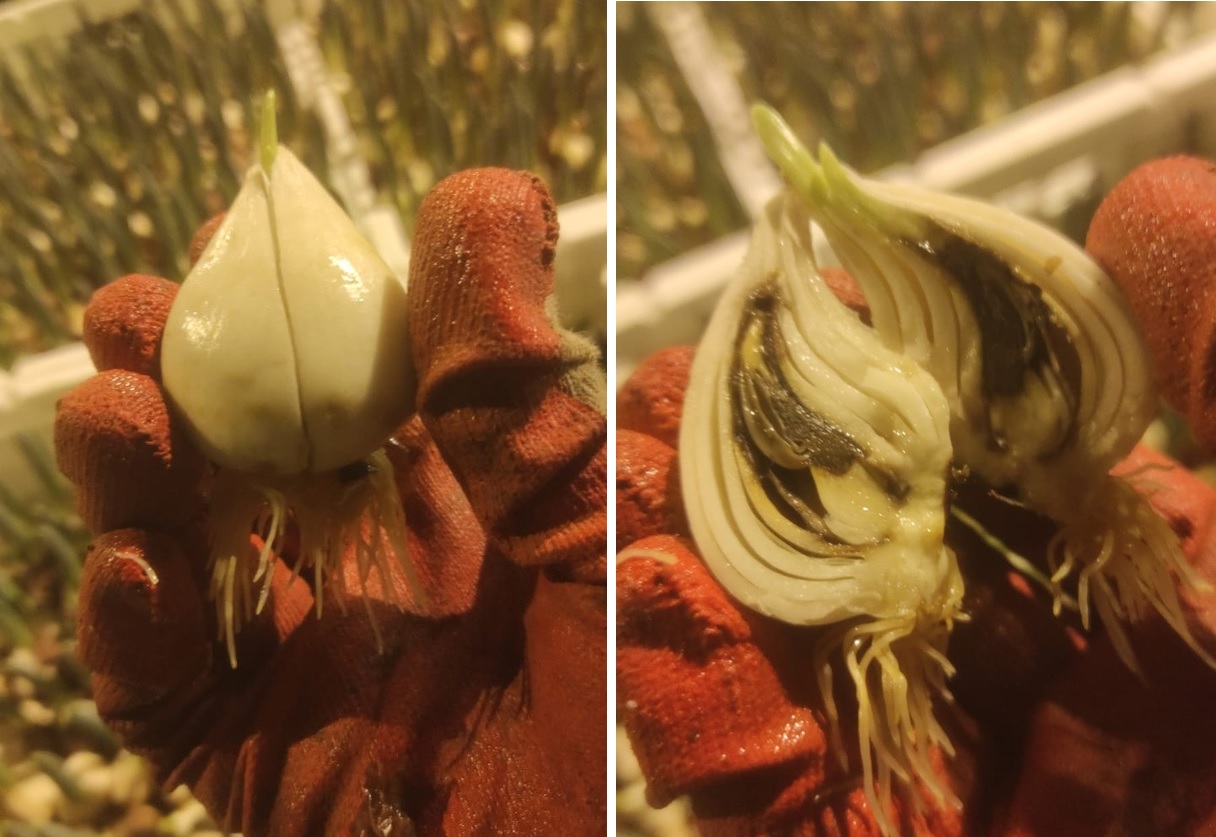 В этом году очень большое количество фузариоза, это грибок который развивается на луковице и поражает её, визуально не всегда возможно определить заражена луковица или нет, наш поставщик использует рентген для выбраковки, система находит пораженные области даже в глубине луковицы и отбрасывает такую луковицу с конвейера, система очень сложная и дорогая у многих поставщиков такой системы нет, луковицу проверяют визуально или не проверяют вовсе, соответственно уменьшение урожая получился разным, какие-то поставщики  без отбраковки луковицы заявили о падении урожая на 25% не проверяя луковицу на фузариоз, наш поставщик заявил о падении урожая на 40%. Такая выбраковка очень важна, практически все производства выращивают луковицу на гидропонике, через воду луковица с фузариозом легко заражает соседние луковицы.